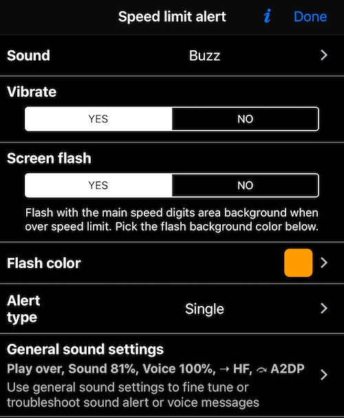 From version 1.8.2 (PRO) you can setup quite more parameters for the alert sound, visual (flash) and logic. Here is the new speed limit alert settings page (Advanced Settings > Speed limit alert):