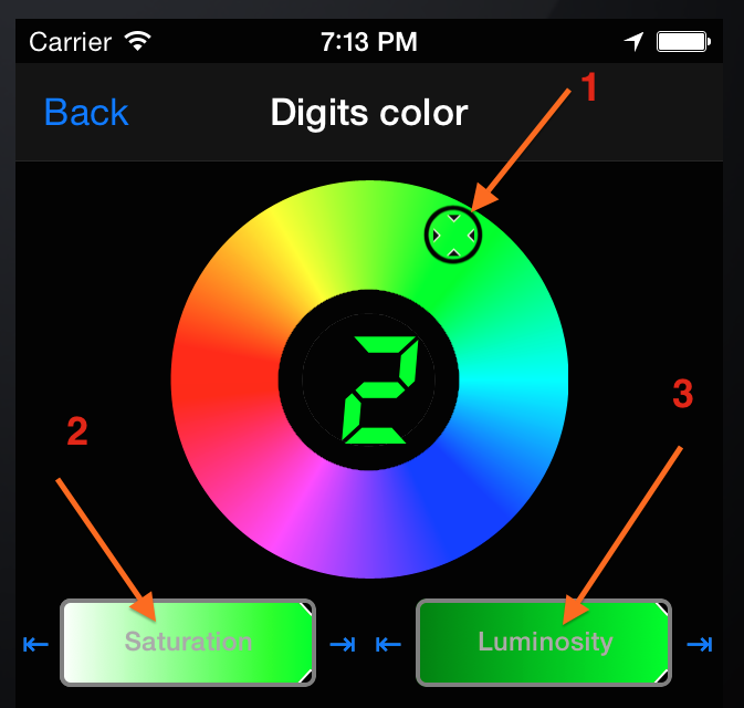 Move color picker circle (#1) with your finger to set the color, and again just use your finger to set the color saturation (#2) and luminosity (#3).