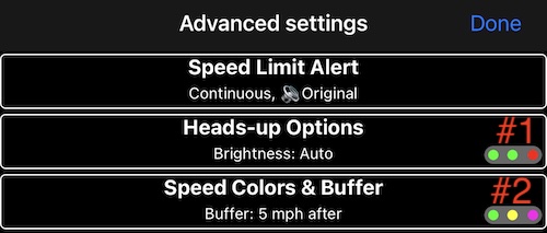 #2 & #2 are speeding buffer type selectors. You either want the buffer to be before the speed limit or after it. If they fine you when you reach 50mph and you want to be visually warned before that, go for BEFORE. If you have some tolerance above the speed limit before you get fined, go for AFTER.