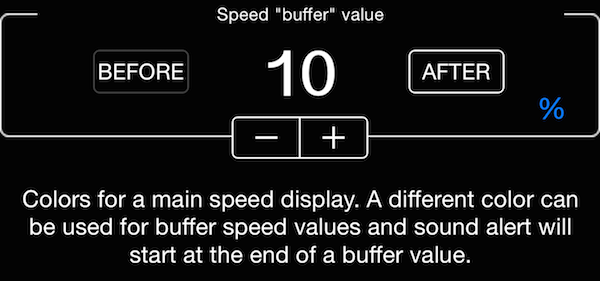 A percentage value can be setup for a buffer value in addition to an absolute value in mph or km/h. Tap on a blue mph or km/h button in the window above to switch to %.