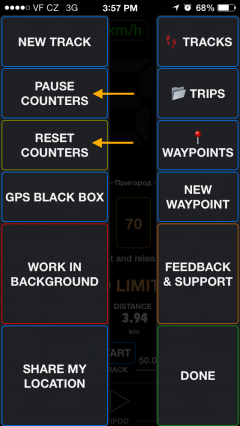 By “Pause counters”, you pause the odometer counter and distance will not be calculated as you drive. In such case you’ll see the pause sign/image on all dashboards. The “Pause counters” option will turn into “Resume counters”, until the trip is “un-paused”.