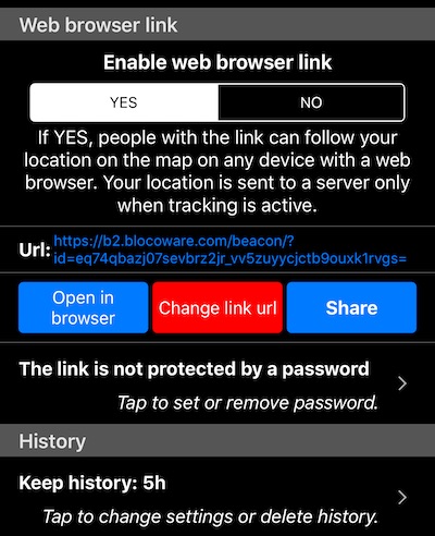 When enabled, GPS beacon allows you to share a link with others to track your real-time location in any web browser. Here is what someone with a link to your beacon might see: