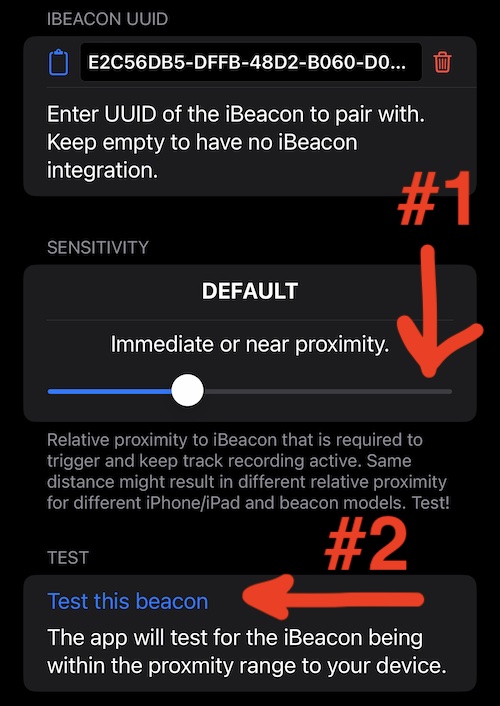 If you have very weak iBeacon (or hidden somewhere in compartment) or very weak bluetooth in iPhone (or cellular iPad) then move sensitivity slider to the Highest position (right most). In this position, tracking will be triggered if iPhone can detect iBeacon(s) with that UUID at all. Proximity to the beacon(s) is not examined.