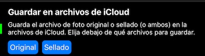 Versión 1.9.4 agrega la opción de copiar la foto original/sellada a la unidad iCloud. Configuración > Ajustes de captura > Guardar en archivos de iCloud: