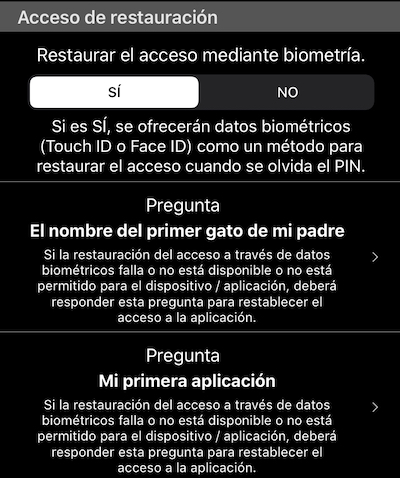 En los escenarios en los que “Desbloquear por datos biométricos” está configurado en NO y usted olvidó el código PIN, después de cierto número de intentos fallidos de PIN, se le ofrecerán opciones de restauración. Si “Restaurar el acceso a través de datos biométricos” es SÍ, se le ofrecerá usar Face o Touch ID como una opción para restaurar el acceso.