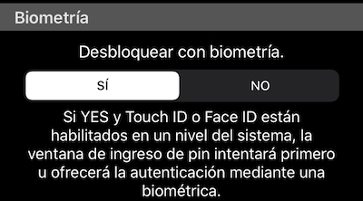 Permite desbloquear la aplicación con Face ID o Touch ID, dependiendo de las capacidades del dispositivo.