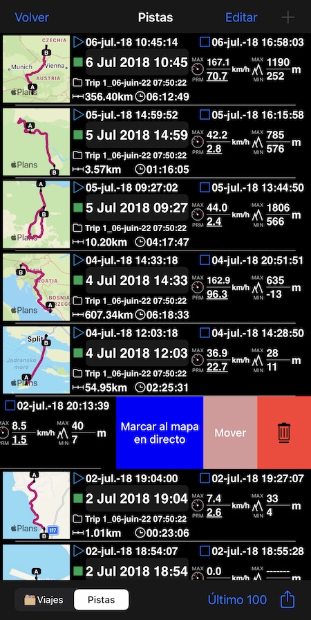En esta lista de rutas que pertenecen al viaje, también puede deslizar el dedo hacia la derecha o hacia la izquierda en la ruta para revelar las opciones de moverse a otro viaje o adjuntar/fijar al mapa en vivo.