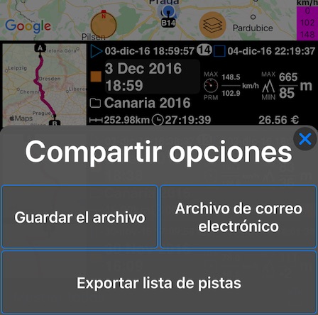 “Guardar el archivo” ofrecerá elegir el formato para compartir (todo el “Archivo de viaje” o Google kmz) y ofrecerá guardarlo en iCloud, Dropbox, etc. La opción “Archivo de correo electrónico” solo ofrece la opción de enviar lo por correo electrónico.