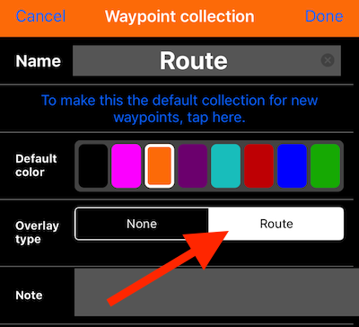 Abra la pantalla de configuración de la colección (MENÚ> COLECCIONES WAYPOINT y toque un botón de configuración en una fila de colección) y configure su “Tipo de superposición” en Ruta: