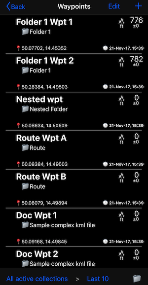 La importación de .KML admite carpetas anidadas donde los puntos de referencia (marcas de posición) en cada carpeta kml y subcarpetas se colocan en una nueva colección de waypoints separada en la aplicación. Incluso si el estándar Kml no establece explícitamente cuál es la “ruta”, después de la importación puede marcar cualquier colección como una ruta. Los waypoints seguramente se importan en el mismo orden en que se colocan en cada carpeta kml.