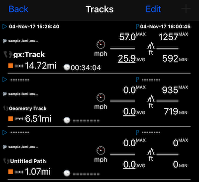 gx: Track tiene información de tiempo, velocidad y altitud. La “pista de geometría” solo tiene información de altitud. “Ruta sin título” no tenía información de tiempo / velocidad o altitud en kml, solo se calcula la distancia para la importación.