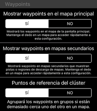 Permite mostrar u ocultar waypoints en un mapa principal o secundario y deshabilitar el agrupamiento de waypoints (que está activado de forma predeterminada):