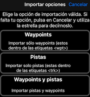 La aplicación ofrece 3 opciones para la importación de GPX: