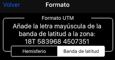 En la configuración> “Formato de coordenadas” toque en una configuración de fila UTM para abrir la nueva pantalla de formato UTM. Puede elegir entre “Hemisferio” (el valor por defecto) y “Banda de latitud”:
