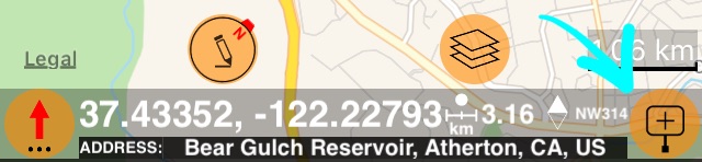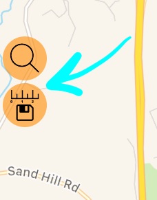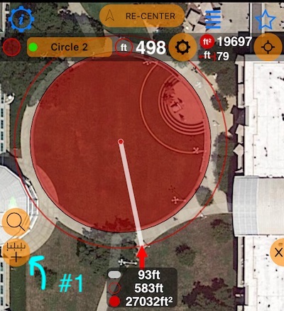Para comenzar a agregar círculos, es mejor usar el botón de medición “+” (# 1) en el centro izquierdo, seleccione “Área ◯”, mueva el mapa para que la flecha roja apunte al punto central del círculo y use un botón de punto de caída para agregarlo: