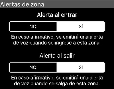 También puede configurar opcionalmente alertas de voz para entrar y salir de zonas circulares. Si se necesitan alertas, actívelas en la pantalla de configuración de recopilación de waypoints, hasta el final: