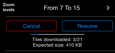 Durante la descarga, puede usar los botones de reanudar o cancelar para detener o borrar los datos de descarga. Si detuvo la descarga, se detuvo debido a los errores o el tiempo de espera del servidor de mapas, puede reanudarlo con un botón Reanudar: