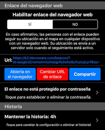 Toque en una fila de protección con contraseña en la sección “Enlace del navegador web” para habilitar o deshabilitar la protección con contraseña para el enlace. Cuando se configura la contraseña para el enlace, será necesario ingresar antes de que se muestre cualquier mapa / datos.