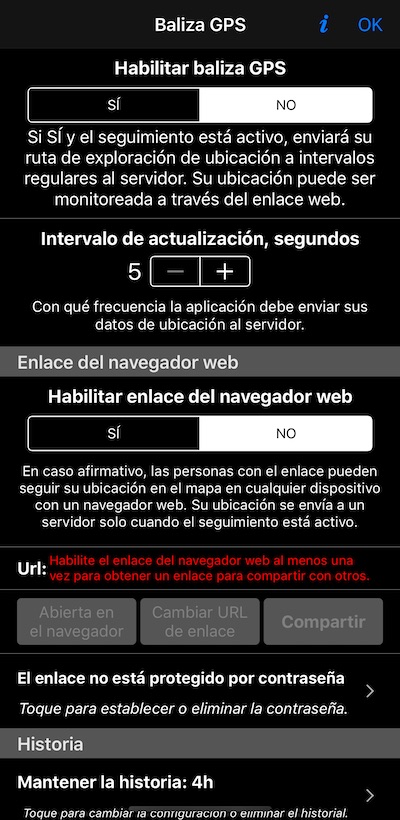 Cuando está habilitado, GPS beacon le permite compartir un enlace con otros para rastrear su ubicación en tiempo real en cualquier navegador web. Incluso cuando está activado, la baliza GPS solo funciona (envía datos a un servidor a intervalos regulares) cuando graba una pista en la aplicación (por ejemplo, MENÚ> NUEVA PISTA comienza una nueva grabación de pista).