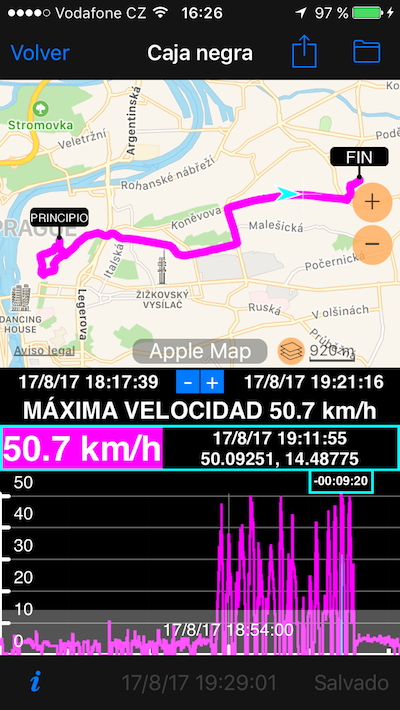 La línea de puntos azul claro cuenta el tiempo hacia atrás aquí, ya que el punto cero es el punto más reciente de la caja negra y se remonta a su historia. En la zona de arriba, verá la hora exacta y las coordenadas para el punto mostrado. Por encima de esto usted tiene el valor máximo de la velocidad para el lapso de tiempo seleccionado.