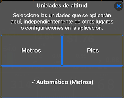 Al tocar en Metros o Pies, “congelará” este campo para mostrar su altitud siempre en Metros o Pies. Si selecciona “Automático”, la aplicación mostrará la altitud en unidades en función de lo que haya configurado en la configuración de la aplicación.