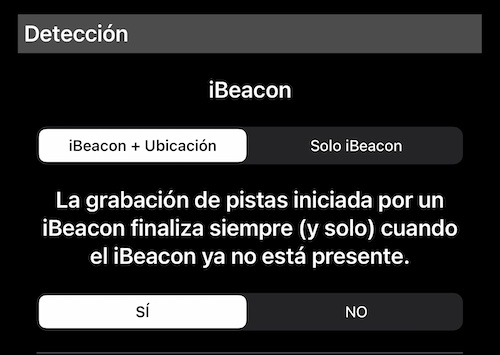 - Según la configuración de Sensibilidad, la fila “Seguimiento de activadores” mostrará SÍ si la constelación actual de iBeacon y iPhone activará el seguimiento, o NO.