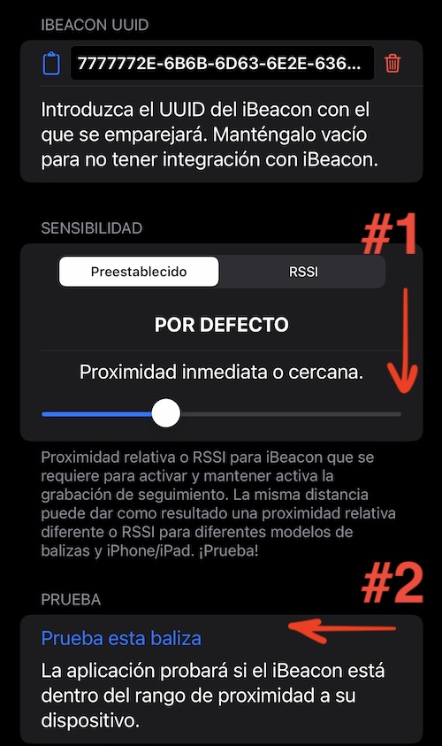 Si tiene un iBeacon muy débil (o está escondido en algún lugar del compartimiento) o un bluetooth muy débil en el iPhone (o iPad celular), mueva el control deslizante de sensibilidad a la posición más alta (más a la derecha). En esta posición, el seguimiento se activará si el iPhone puede detectar iBeacon(s) con ese UUID. No se examina la proximidad a la(s) baliza(s).