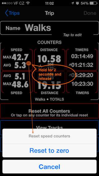 Ahora puede revisar los contadores de viajes actuales y totales y al presionar con el dedo una celda de contador específica y soltarla, obtendrá las opciones de restablecimiento de un contador en particular: