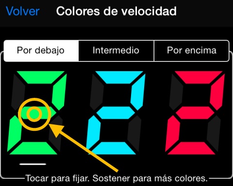 Capacidad de fijar los dígitos de velocidad de cualquier color. Sostén el dedo sobre un dígito en “Ajustes avanzados” >”Colores de velocidad” u “Opciones de tablero y pantalla completa”: