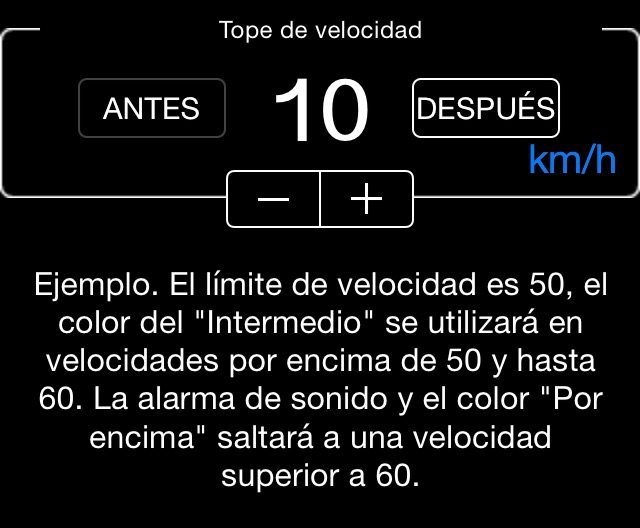 Una solicitud frecuente era tener un valor de 50 km/h como límite de velocidad pero que avisaran a, digamos, 55 km/h. ¡Ahora es posible! Confíguralo en “Configuración avanzada” > “Colores de velocidad y buffer”. Se puede aplicar un porcentaje de valor para un valor de buffer además de un valor absoluto km/h (mph y nudos). Pulsa en el botón azul de mph o km/h para cambiar el %: