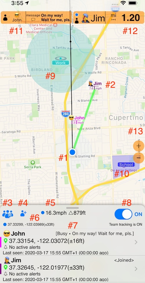 - Lista de miembros. Contraído por defecto, arrastre el cajón hacia arriba para ver la lista. Toque una fila con un miembro del equipo para ver las opciones para editar, volver a invitar a un miembro, mostrar una línea entre usted y el miembro o centrar el mapa en la ubicación de un miembro.