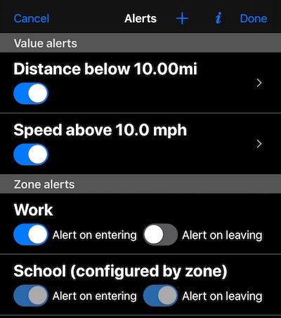 Toque un botón “+” para agregar una alerta de valor para la velocidad o la distancia entre usted y el miembro. Toque una fila de alerta de valor existente para editarla o eliminarla.