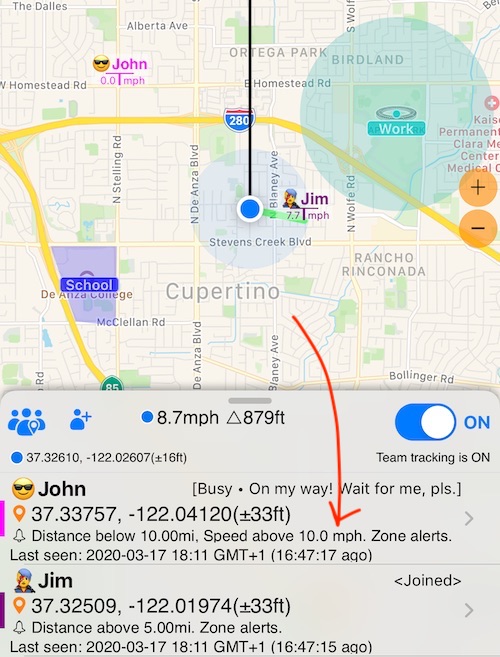 Para cada zona que haya creado, habrá una fila en la sección “Alertas de zona”. Si ha configurado en el editor de zona las alertas que se darán a “todos los miembros del equipo”, entonces esta configuración de la zona se aplica globalmente a todos los miembros del equipo y no puede anularla aquí (Zone School sirve como ejemplo aquí). De lo contrario, si no hay una configuración de alerta de “todos los miembros del equipo” en la zona, puede anular / configurar alertas para esa zona aquí (la zona de trabajo anterior es un ejemplo de esto).