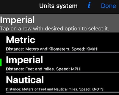 - Impérial. Utilise les pieds et les miles pour la distance et MPH pour la vitesse.