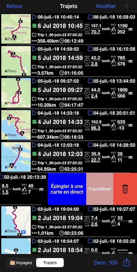 “Dernière 100” est un bouton de filtre - pour vous donner la possibilité de filtrer les trajets par date de début ou de fin ou simplement d’afficher les X dernières trajets.