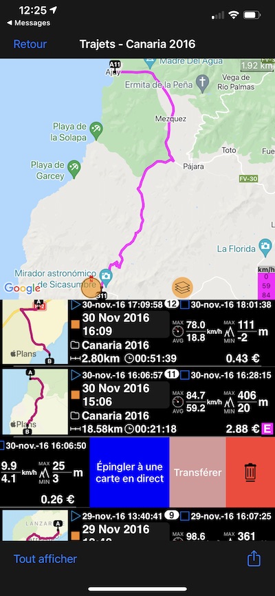 Appuyez sur le bouton “liste” pour voir toutes les trajets de ce voyage :