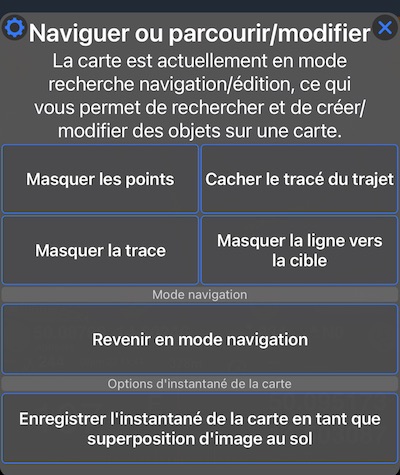 pour afficher les options de carte du mode navigation. Les options présentes dans ce menu peuvent être différentes pour différentes applications (par exemple, l’enregistrement de l’instantané de la carte est la seule option disponible dans l’application Planimeter 55).