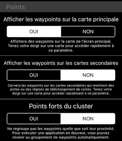 Permet de montrer ou de masquer les waypoints sur une carte principale ou secondaire et de désactiver le groupement de waypoints (qui est activé par défaut) :