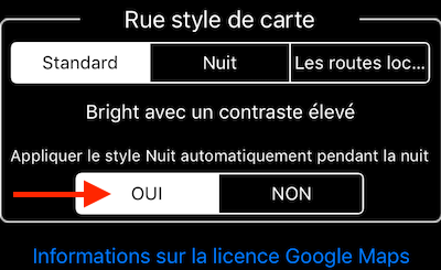 Nouvelle option pour appliquer automatiquement Google nuit style de carte pendant la nuit. Ce fut une honte d’avoir des informations sur le coucher du soleil / lever de soleil dans l’application, mais ne pas l’utiliser pour forcer le commutateur de mode carte. Par défaut, l’option est laissée à NO, s’il vous plaît visitez carte Google paramètres pour modifier vos préférences: