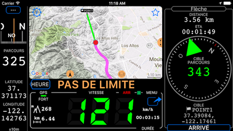 Flèche pointée vers votre cible, boussole et coordonnées.