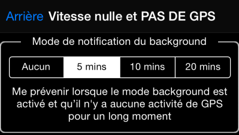 Le compteur de vitesse peut maintenant vous communiquer quand vous l’avez laissé sur la fonction de suivi ou de travail en background et qu’il n’y avait aucune activité de GPS pour un long moment. Configurez dans « Paramètres avancés » > « Vitesse zéro ou SANS GPS » > « Mode de notification du background »