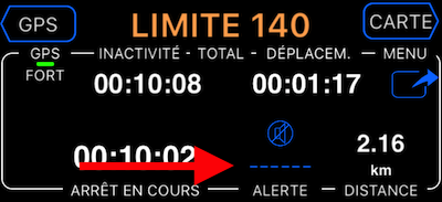 Dans ce mode, le panneau TIME affiche le moniteur de temps de veille / temps de déplacement et permet de configurer l’alerte de durée d’arrêt actuelle. Par défaut, l’alerte est désactivée. Tapez sur un bouton @ “——-” au-dessus de l’étiquette ALERT dans le tiret de temps pour ouvrir les paramètres d’alerte: