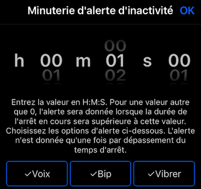 Revenez à l’écran principal et maintenant, chaque fois que vous arrêtez plus longtemps que le seuil d’alerte inactif, vous serez averti par un bip, un message vocal ou une vibration.