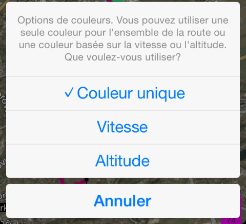 Une route enregistrée peut être affichée sur une carte, colorée par la vitesse ou l’altitude. Appuyez sur une boîte violette avec des valeurs de vitesse minimum, moyenne et maximum pour ouvrir les options de coloration de la route: