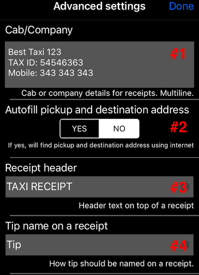 # 2 Basculer pour autoriser ou interdire la recherche automatique d’une adresse de début et de fin d’un trajet. NON par défaut Si la réponse est OUI, l’application tentera de résoudre automatiquement l’adresse du début et de la fin du voyage et utilisera cette information sur un reçu.