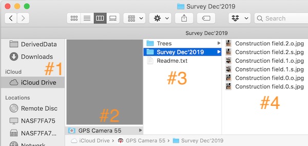 「GPS Camera 55」iCloudフォルダーの下のコレクションサブフォルダーに対応する写真がコピーされます。 Mac iCloudファイルの例を次に示します。