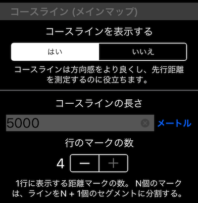 地図上にコースラインを表示するかどうかを設定することができます。はいの場合は、その長さを設定します。