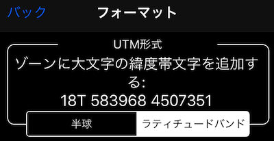 設定> [座標形式]でUTM行設定をタップして、新しいUTM形式の画面を開きます。 「Hemisphere」(デフォルト)と「Latitude band」から選択できます。