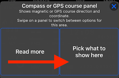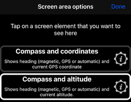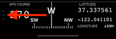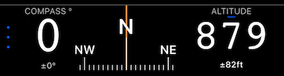 コンパス+座標パネルをコンパス+高度に切り替えることができます。 ボトム(または左側)のコンパスパネルをスワイプしてコンパス+標高パネルに切り替えるか、「3ドット」ボタンを使用します: