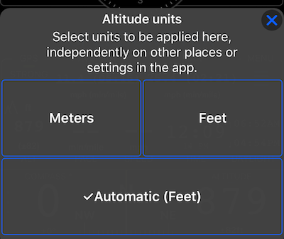 パイロットからの別の要求は、アプリの他の設定で独立して高度をフィートまたはメートルで表示することでした。 “ALTITUDE"ラベルの下をタップすることで、このための設定を開くことができます: